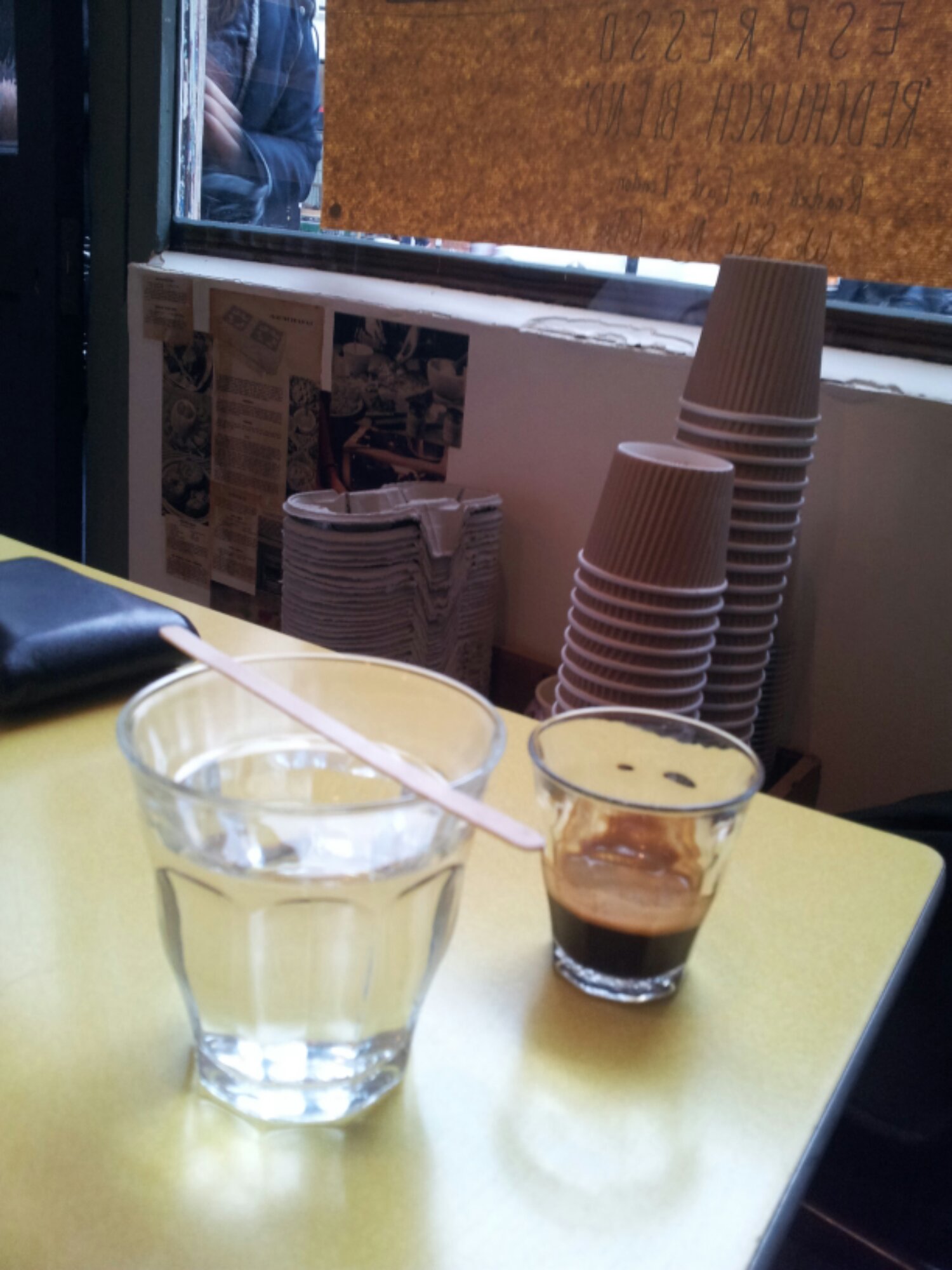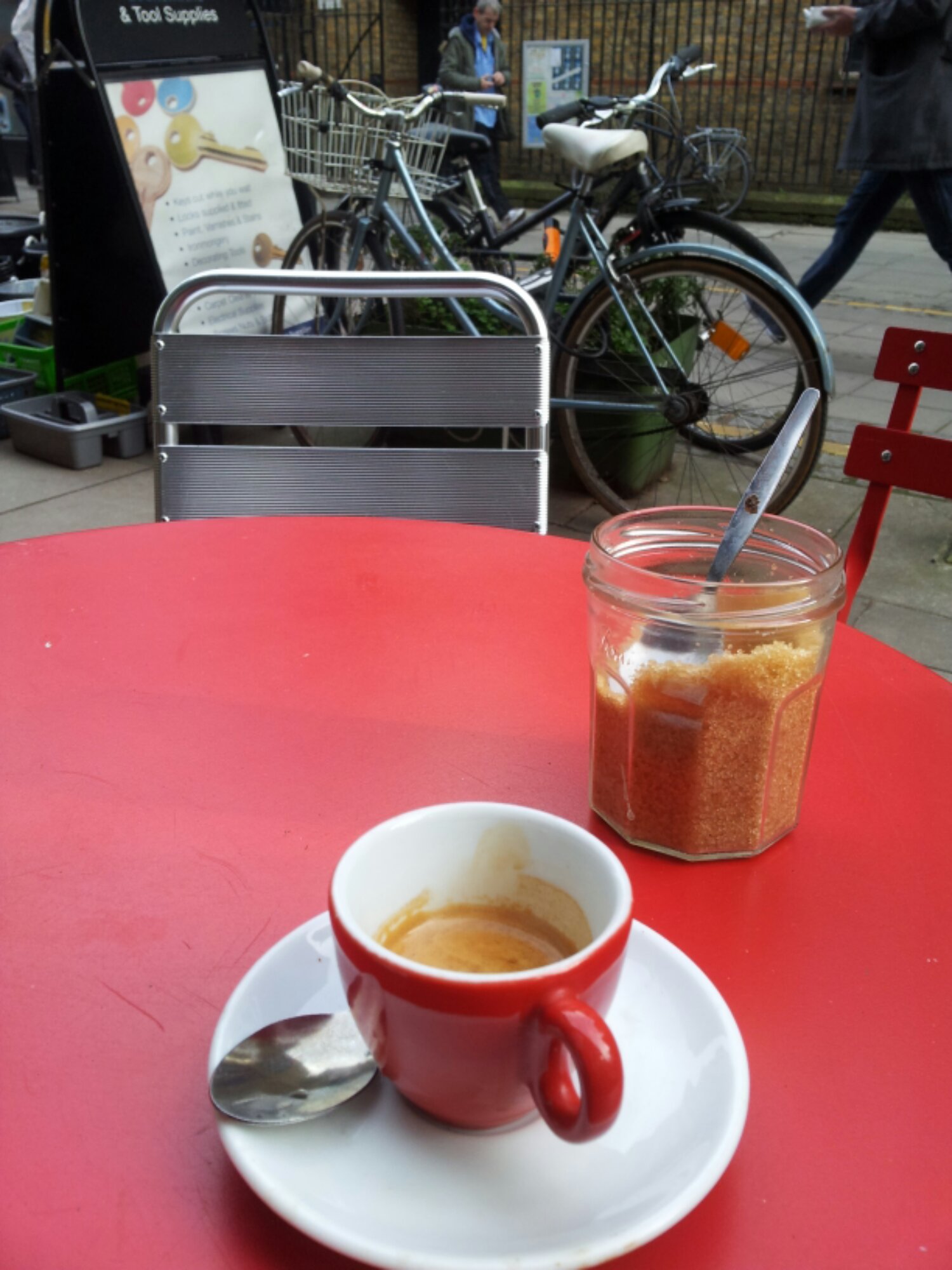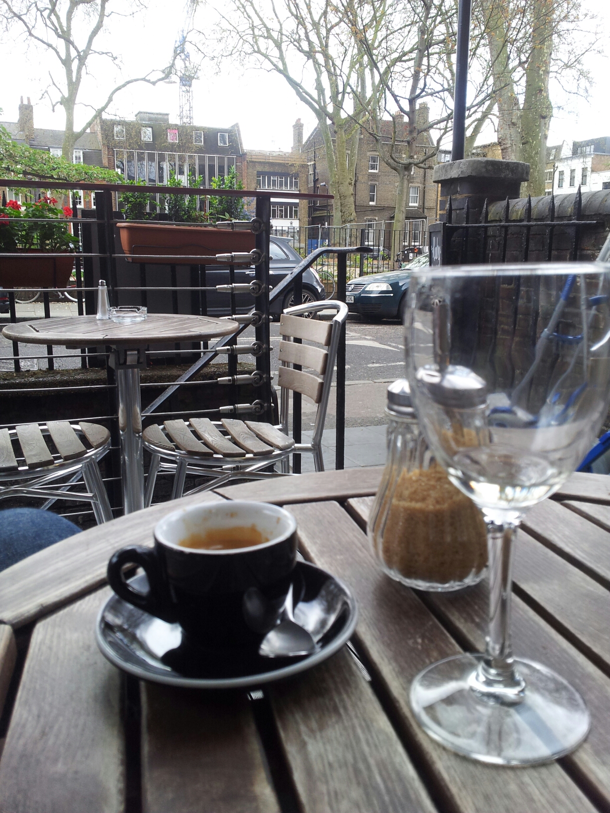 On the corner of Exmouth Market, opposite the Cafe Nero, is this spacious licensed café full of well dressed architect-types – relaxed open shirts, jeans, expensive tweedy blazer and thick-rimmed glasses (for the men). Good, very short coffee. Complimentary glass of water (nice touch that you get in upmarket places). 14 tables and some stools. Windows all round and some benches outside. It’s also a bar, with food and a wide range of drinks. Nice, efficient staff.